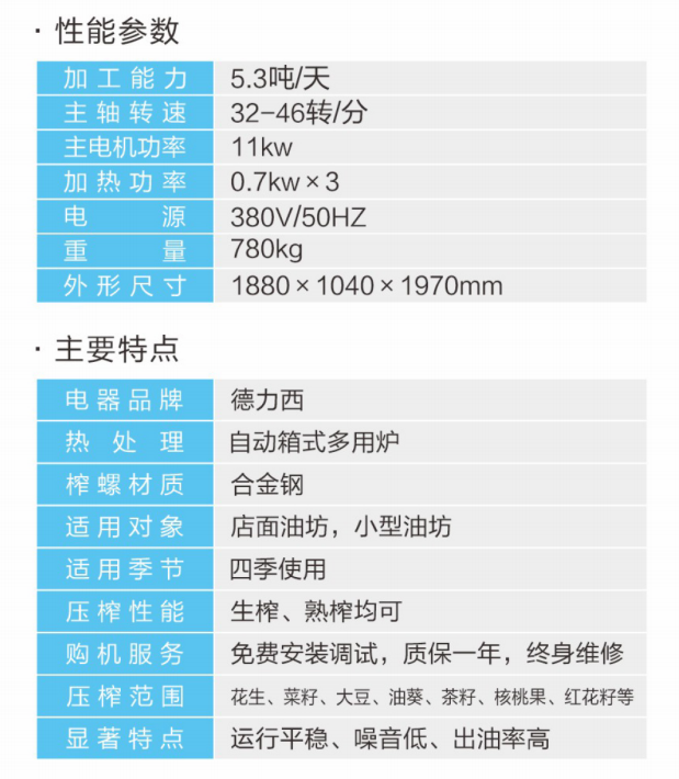 ★压榨范围:花生、大豆、菜籽、油葵、茶籽、芝麻等;★适用对象:店面油坊和微小油坊;★压榨性能:热榨一次榨尽,免费安装调试