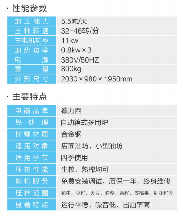 ★压榨范围:花生、大豆、菜籽、油葵、茶籽、芝麻等;★适用对象:店面油坊和微小油坊;★压榨性能:热榨一次榨尽,免费安装调试